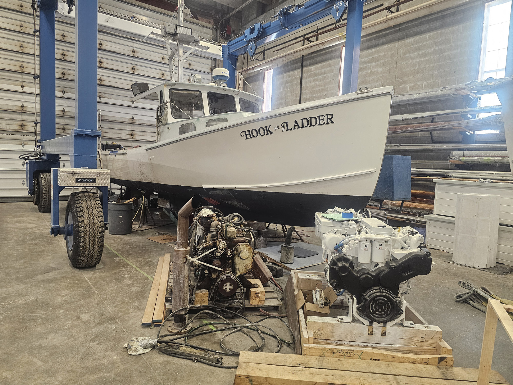 At Kittery Point Yacht Yard in Eliot one of the big projects this winter was refurbishing this Holland 38 tunaboat, which hails from Ogunquit. They refinished the hull and top and did some interior refinishing. She was ready to be hauled outside so they could put her tower back on.