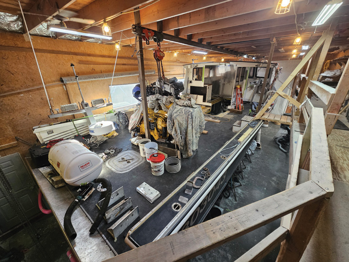 In the main shop they have an Osmond 40 lobster boat, which is getting repowered. They have removed a 600-hp Cummins and are replacing it with an 815-hp FPT. They are also replacing all the hydraulics, new generator, some wiring, replacing the single ram steering with a dual ram system, new boxes, new shaft and refinishing the topsides. This project will be completed and out the door early in March.