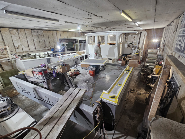 The other 42 is being finished out as a pleasure cruiser for a customer from Halifax, Nova Scotia. She has similar accommodations, with the exception that the head/shower is all one. This is located on the starboard side just in front of the utility locker. On the portside there is a larger lower berth with a smaller upper berth. She also has a tuna door, on deck live well, tuna coffin, solar panels on the shelter top and a water maker. This boat will be powered with a 900-hp Scania. She will be used mostly for cruising, hopefully all the way to the Bahamas, and do a fishing tournament here and there. This one will not be launched until the summer of 2027.